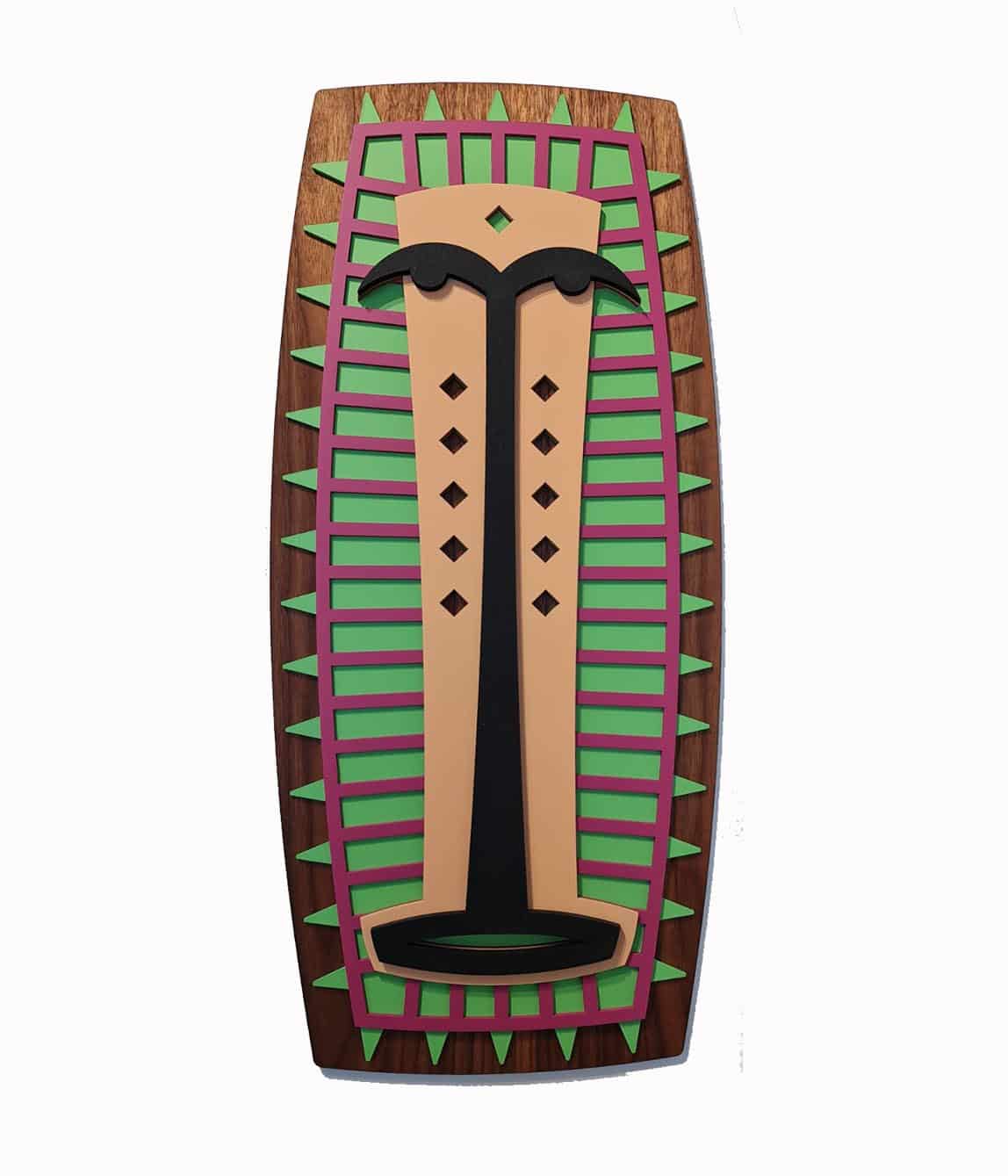 A handmade decorative wooden mask inspired by Picasso, Cubism, shapes and outlines - the Abstrasso Mask #7's compositions of colors create unique combinations of depths on the surface.